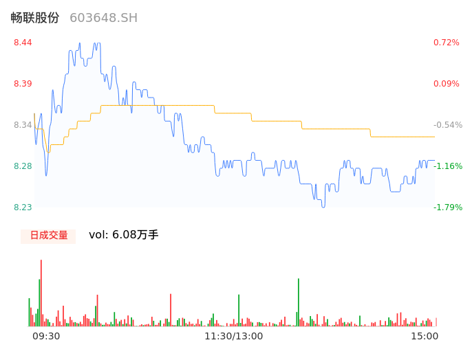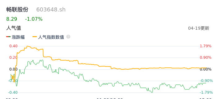 04月19日,畅联股份收报8.29,股价涨幅-1.07%,成交金额5058.98万元,换手率1.68%。