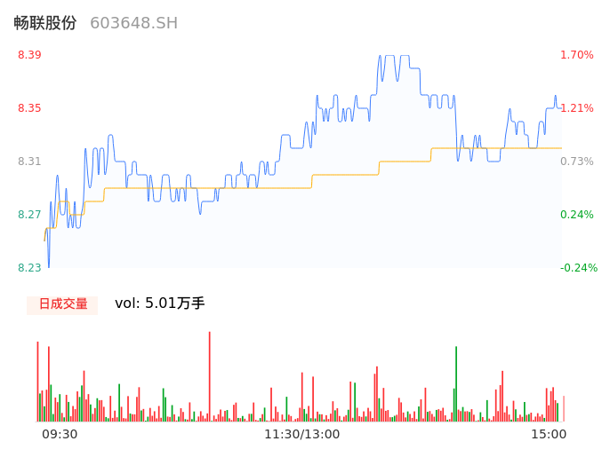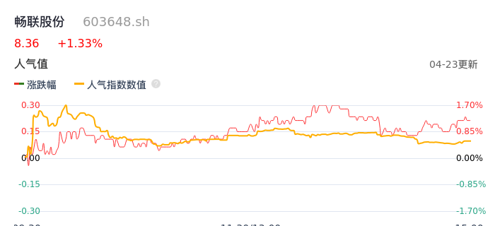 04月23日,畅联股份收报8.36,股价涨幅1.33%,成交金额4166.76万元,换手率1.38%。