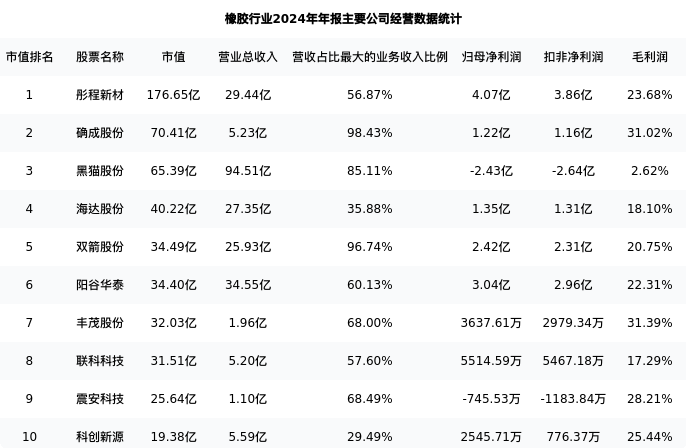 彤程新材最新报告期数据为年报,下表汇总了橡胶行业内市值靠前的公司年报主要经营数据
