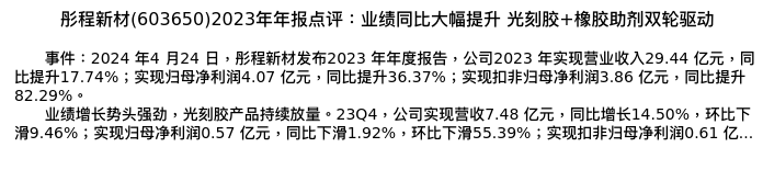 值得注意的是:2024年04月民生证券的方竞/李萌分析师,首次发布关于彤程新材的研究报告,标题为:彤程新材(603650)2023年年报点评:业绩同比大幅提升 光刻胶+橡胶助剂双轮驱动。