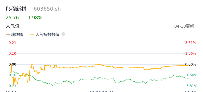 04月10日,彤程新材收报25.76,股价涨幅-1.98%,成交金额1.01亿元,换手率0.66%。