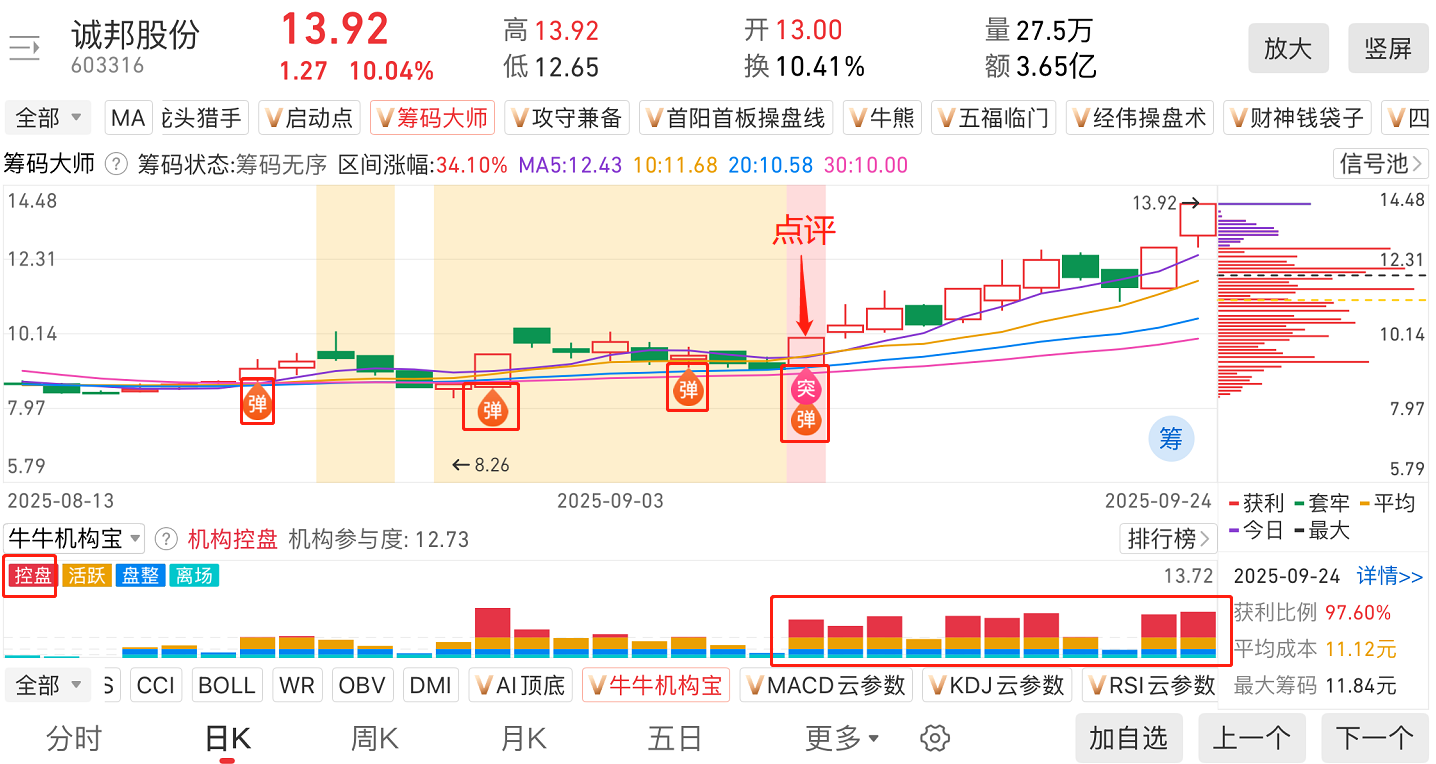 9月10号点评的诚邦股份人家就是先沿着20日均线走趋势,然后再加速走出了2连板行情。