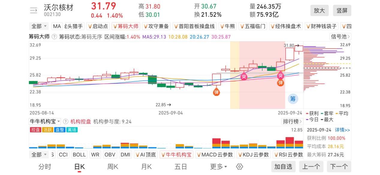 今天的作业是大家根据指标分析一下咱们9月11号点评的沃尔核材,最近三天涨势喜人,那接下来还会不会涨呢?