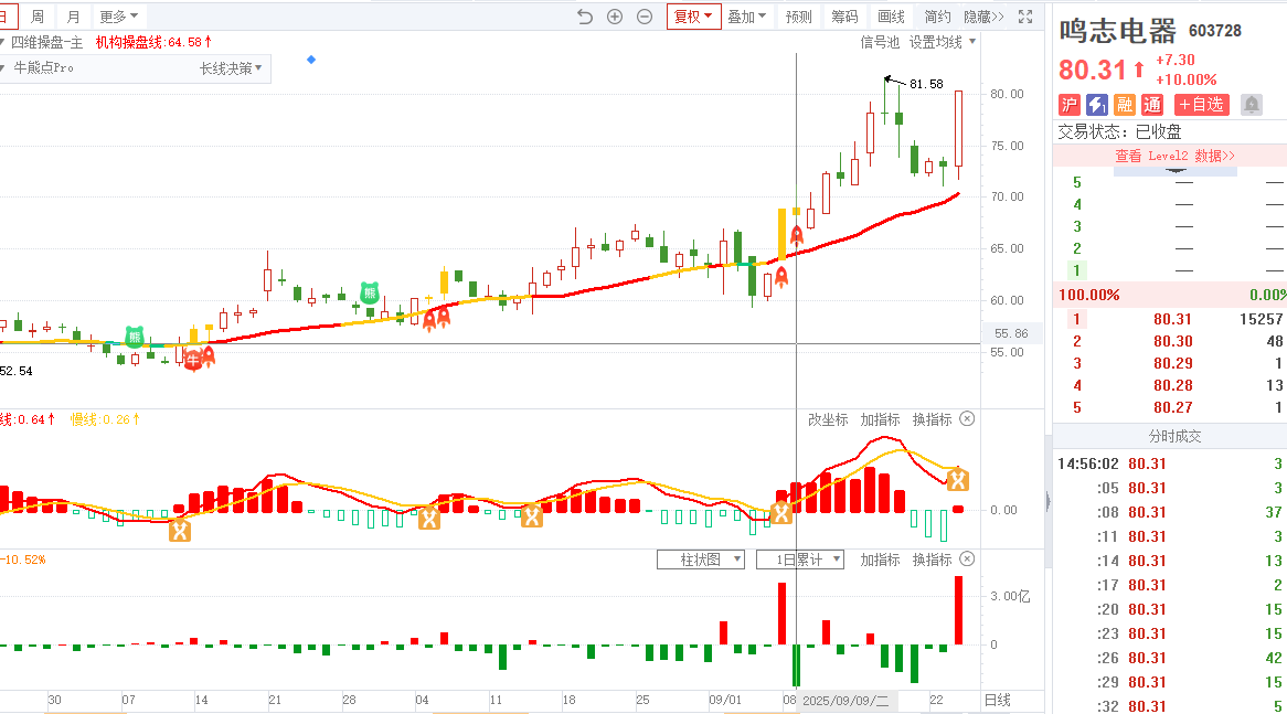 3)20250909-鸣志电器-四维操盘-近期出现火箭信号且底部量柱由绿转红