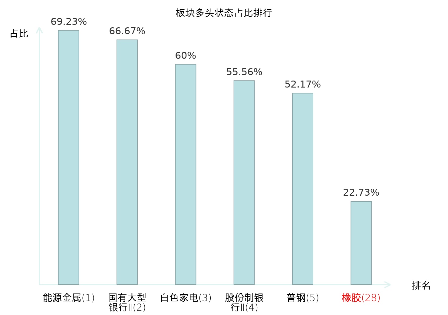 全市场所有行业板块中主力多头状态占比排名中,能源金属板块位居第一。贸易Ⅱ板块名次提升最快,较昨日上升69位。
