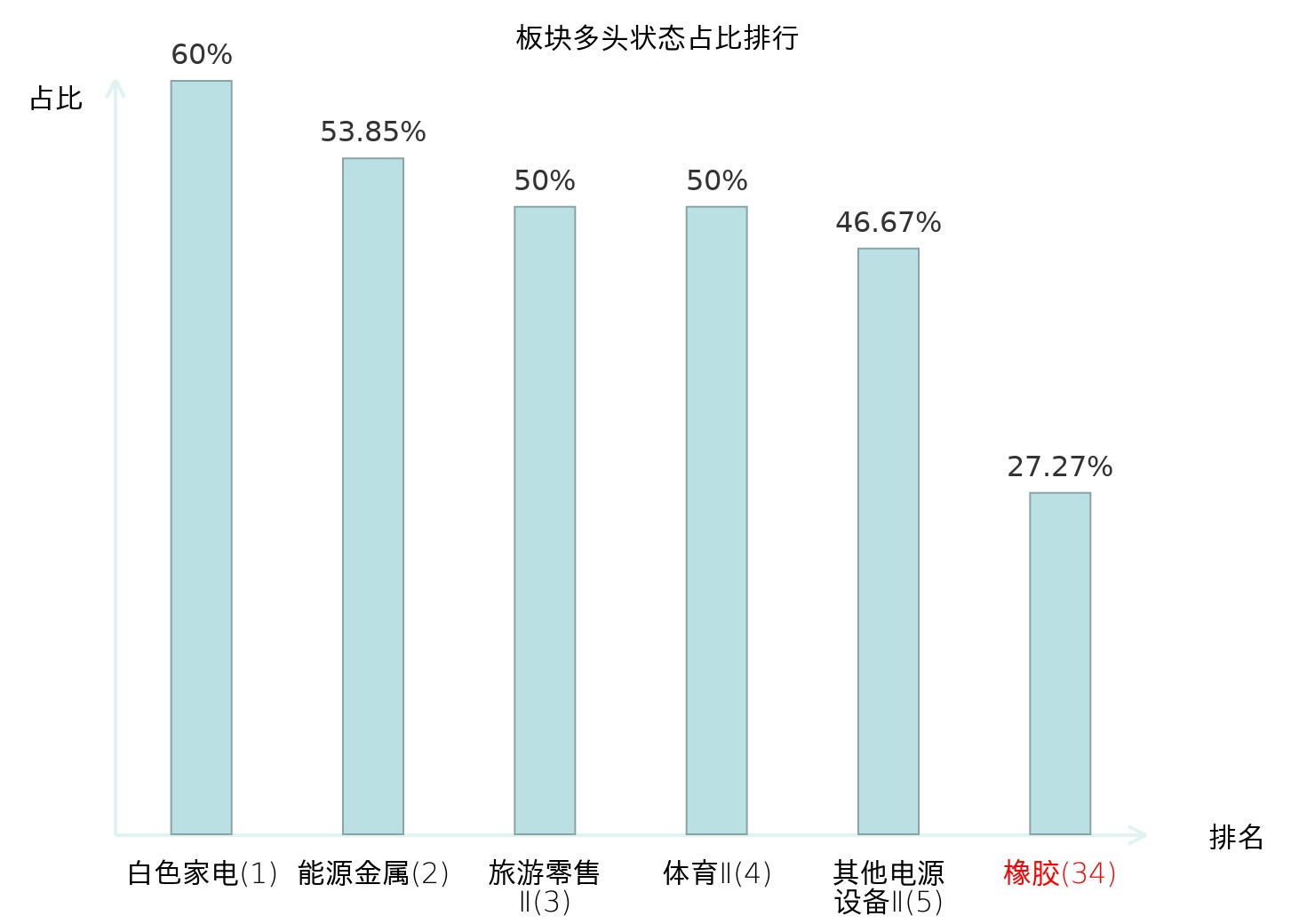 全市场所有行业板块中主力多头状态占比排名中,白色家电板块位居第一。体育Ⅱ板块名次提升最快,较昨日上升127位。