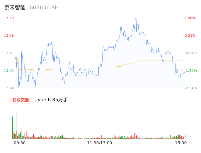 04月11日,泰禾智能收报13.05,股价涨幅-1.51%,成交金额8988.81万元,换手率3.74%。