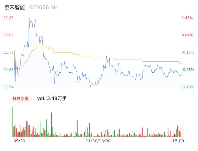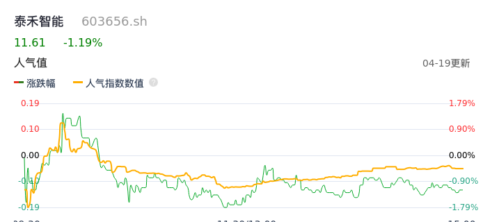 04月19日,泰禾智能收报11.61,股价涨幅-1.19%,成交金额4070.27万元,换手率1.90%。