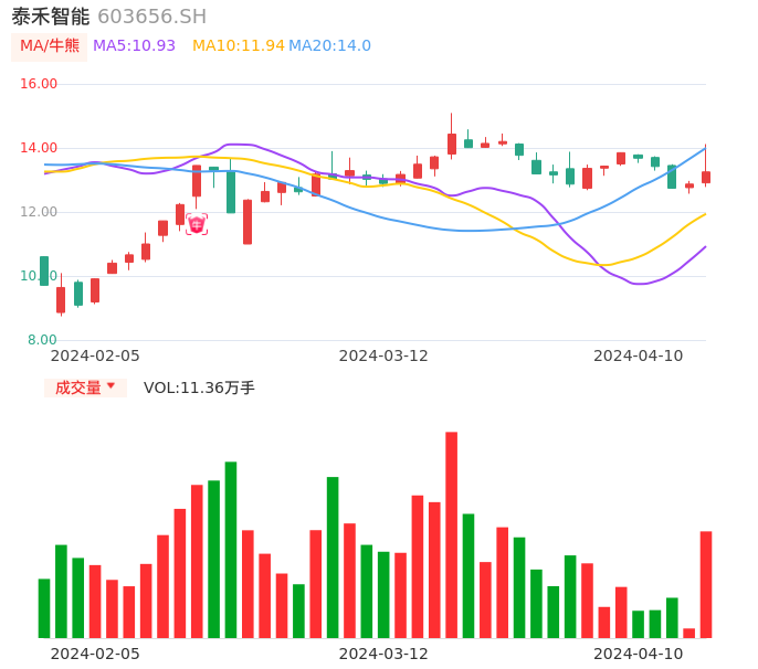 泰禾智能在2月26日出现日线级别牛点,与60分钟牛点形成共振,目前还未完全进入快速上涨通道,注意上方筹码压力位:13.35元,如有效突破可积极关注。