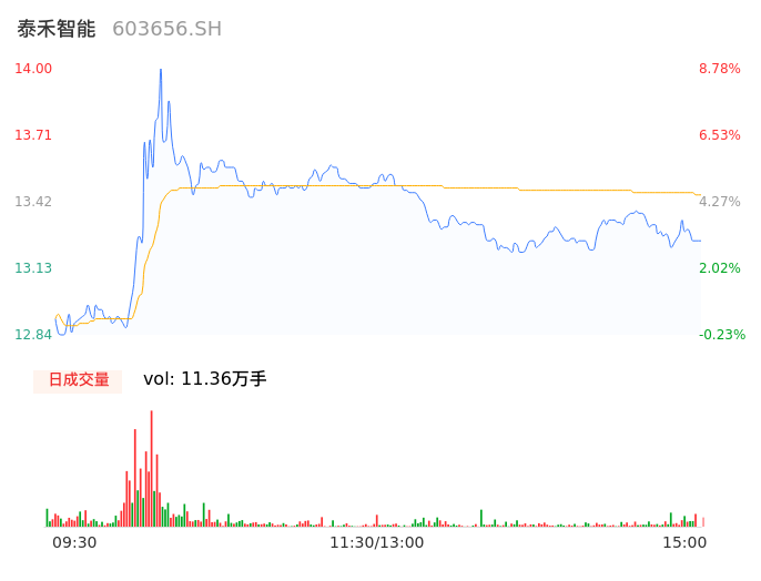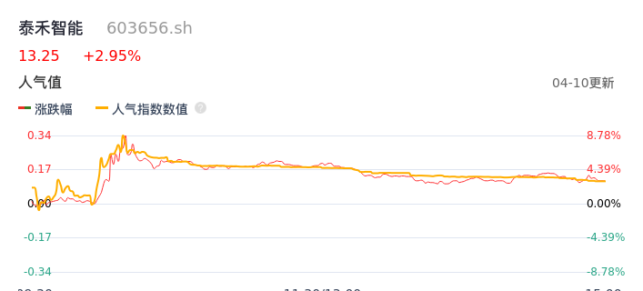 04月10日,泰禾智能收报13.25,股价涨幅2.95%,成交金额1.53亿元,换手率6.20%。