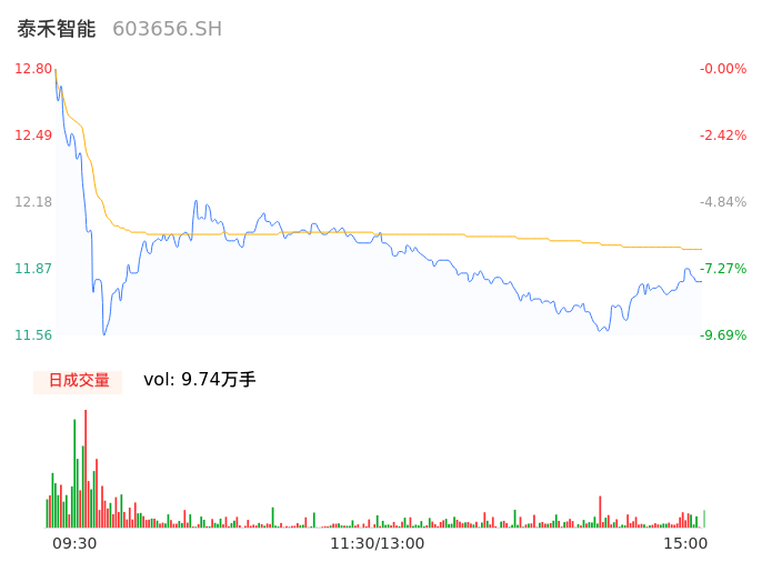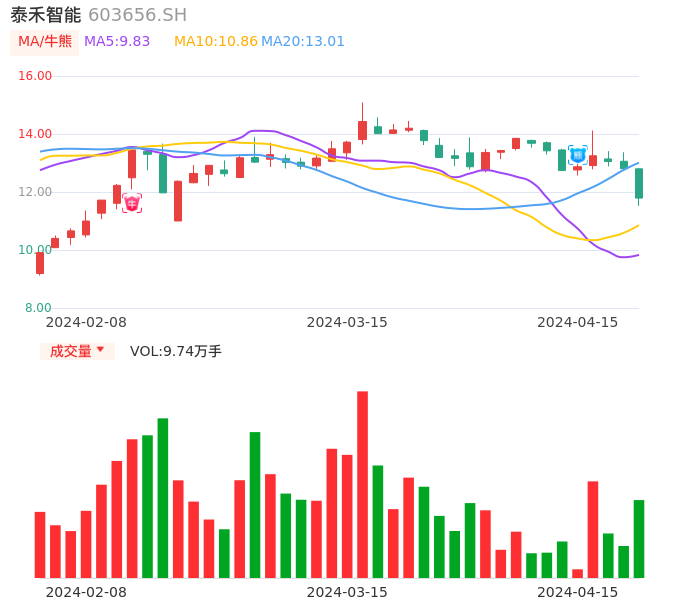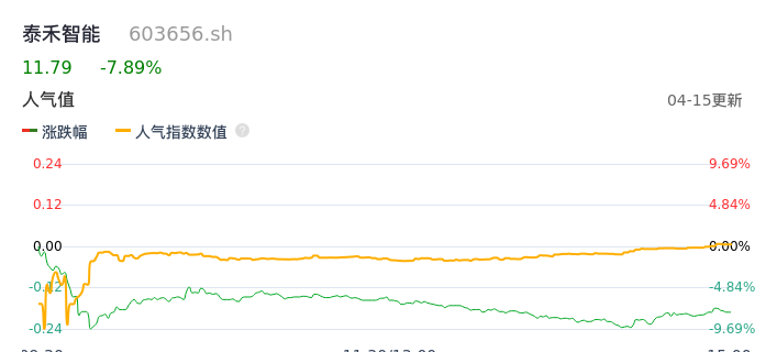 04月15日,泰禾智能收报11.79,股价涨幅-7.89%,成交金额1.17亿元,换手率5.31%。