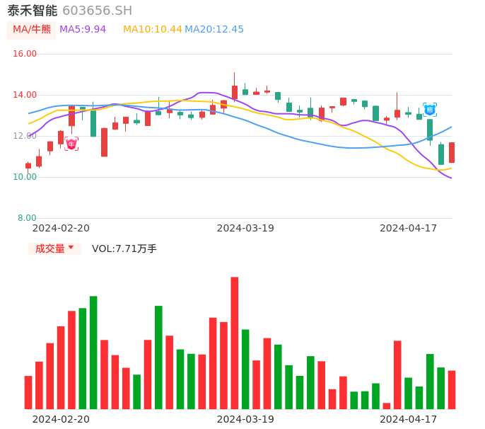 04月17日,泰禾智能收报11.67,股价涨幅9.99%,成交金额8799.59万元,换手率4.21%。