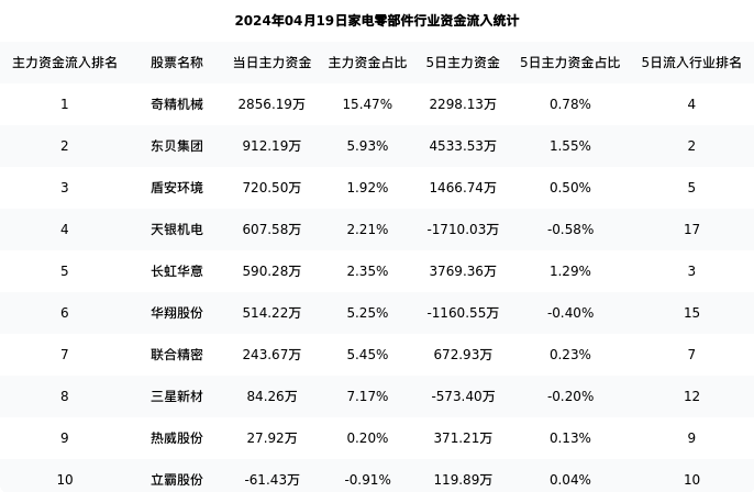 从主力资金流向来看,家电零部件行业今日主力资金流入10.67亿元,在所有申万二级行业中排名:23/131。