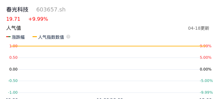 04月18日,春光科技收报19.71,股价涨幅9.99%,成交金额2088.39万元,换手率0.78%。