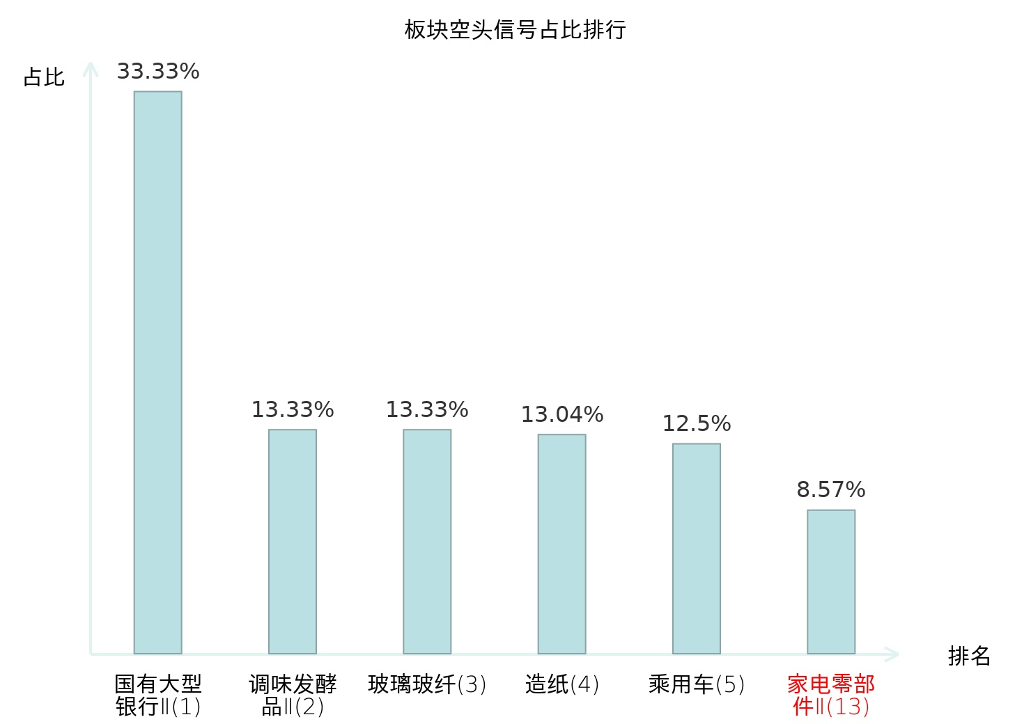 从主力宝信号数据分析,春光科技所属的家电零部件Ⅱ板块中共有3只股票发出主力空头信号,主力空头信号占比在全行业中排名第13位,较昨日上升了97位。较高的排名表明主力当日卖出意愿较强,此次排名上升可能反映了主力对该板块态度的更加谨慎。全市场所有行业板块中主力空头信号占比排名中,国有大型银行Ⅱ板块位居第一。化学制品板块名次提升最快,较昨日上升了117位。这些变动揭示了不同行业间主力资金动向的变化,为投资者提供了关于市场情绪和潜在投资风险的重要线索。