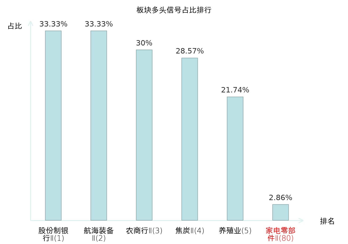 全市场所有行业板块中主力多头信号占比排名中,股份制银行Ⅱ板块位居第一。焦炭Ⅱ板块名次提升最快,较昨日上升119位。