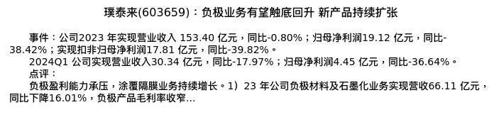 值得注意的是:2024年04月信达证券的武浩/孙然分析师,首次发布关于璞泰来的研究报告,标题为:璞泰来(603659):负极业务有望触底回升 新产品持续扩张。