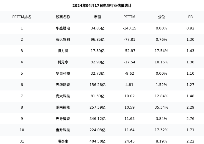 从估值角度看:璞泰来最新市盈率PETTM为24.45,在行业内排名26/93,处于8.19分位。