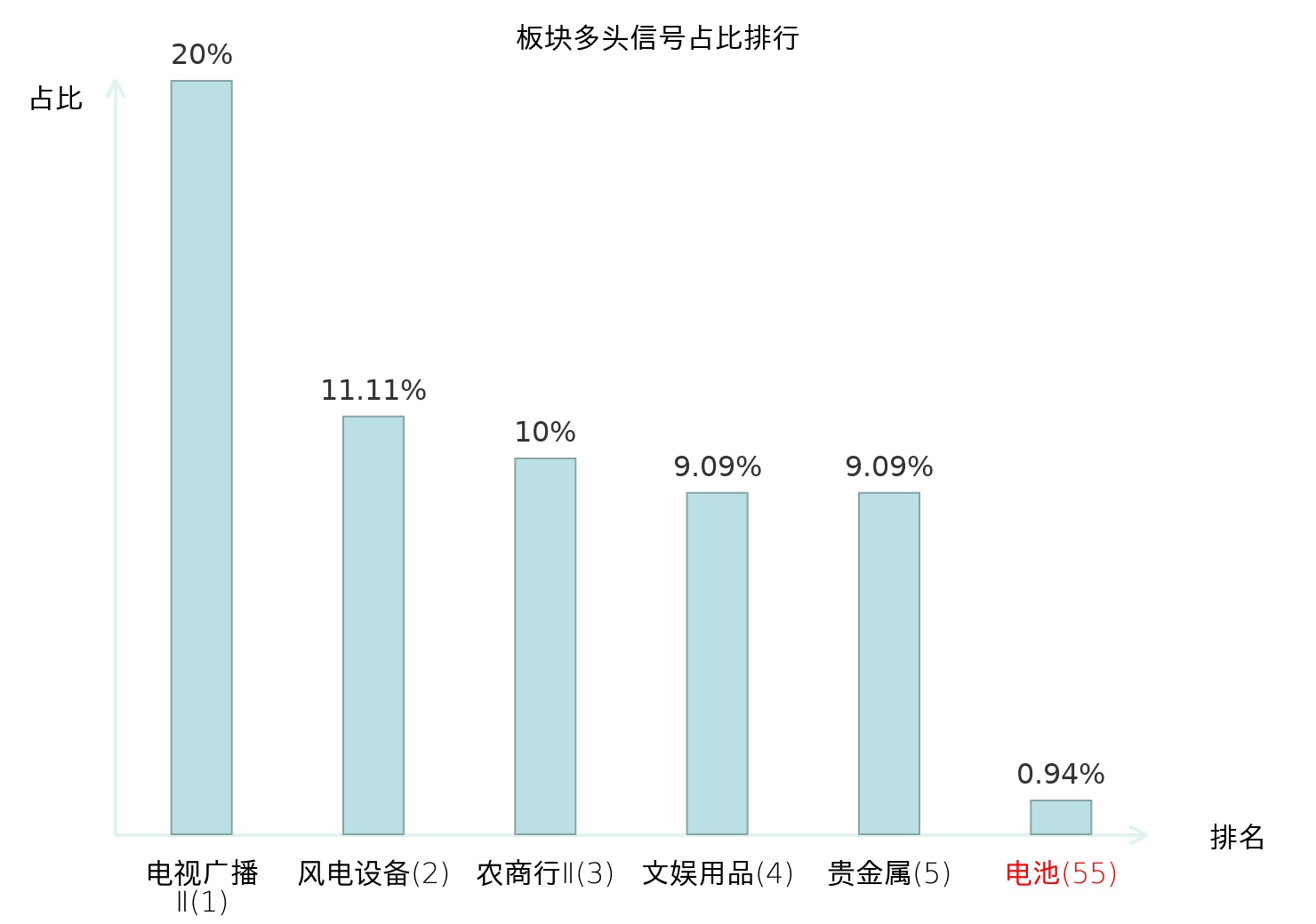全市场所有行业板块中主力多头信号占比排名中,电视广播Ⅱ板块位居第一。农商行Ⅱ板块名次提升最快,较昨日上升112位。