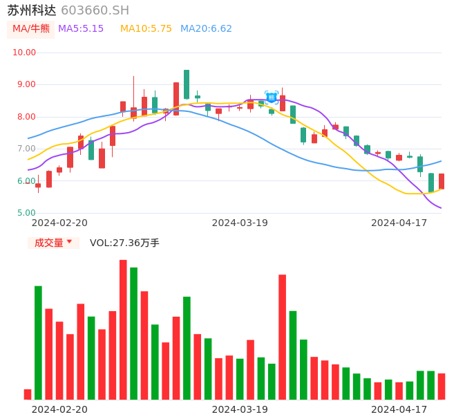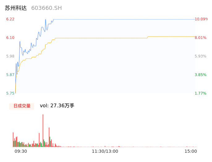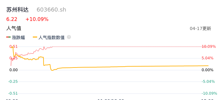 04月17日,苏州科达收报6.22,股价涨幅10.09%,成交金额1.67亿元,换手率5.53%。
