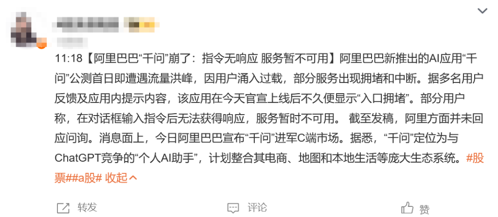 然而,公测首日火爆的访问量也带来了挑战。新推出的AI应用“千问”公测首日即遭遇流量洪峰,因用户涌入过载,部分服务出现拥堵和中断。