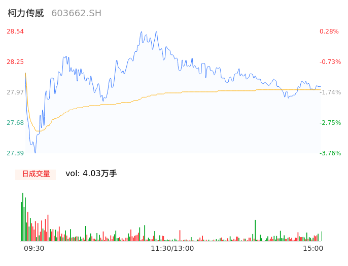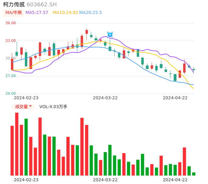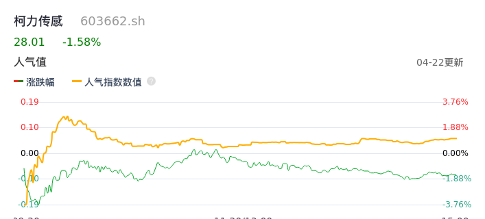 04月22日,柯力传感收报28.01,股价涨幅-1.58%,成交金额1.13亿元,换手率1.44%。
