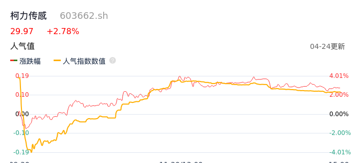 04月24日,柯力传感收报29.97,股价涨幅2.78%,成交金额2.98亿元,换手率3.57%。