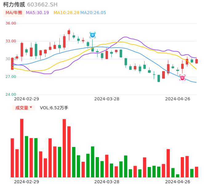 04月26日,柯力传感收报29.94,股价涨幅1.73%,成交金额1.94亿元,换手率2.32%。