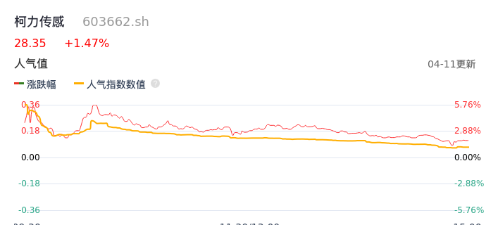 04月11日,柯力传感收报28.35,股价涨幅1.47%,成交金额2.78亿元,换手率3.41%。