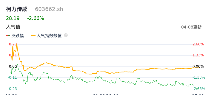 04月08日,柯力传感收报28.19,股价涨幅-2.66%,成交金额1.62亿元,换手率2.03%。