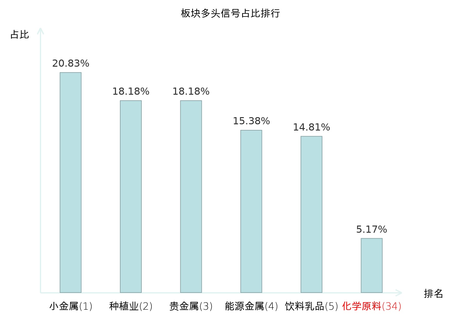 全市场所有行业板块中主力多头信号占比排名中,小金属板块位居第一。房屋建设Ⅱ板块名次提升最快,较昨日上升111位。