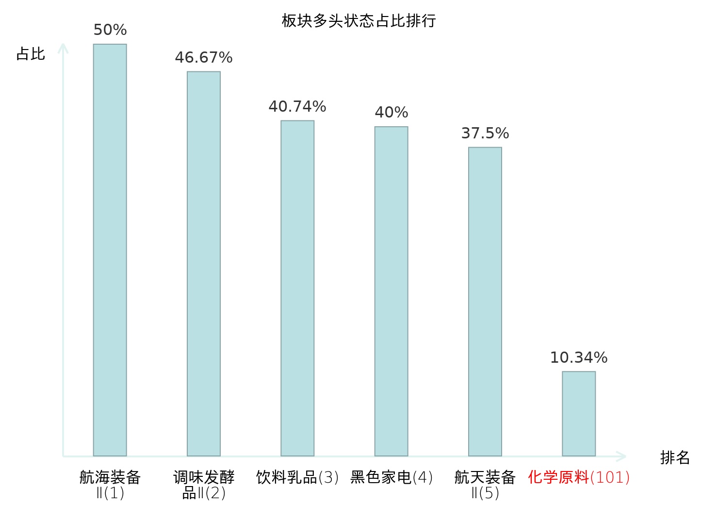 全市场所有行业板块中主力多头状态占比排名中,航海装备Ⅱ板块位居第一。航海装备Ⅱ板块名次提升最快,较昨日上升99位。
