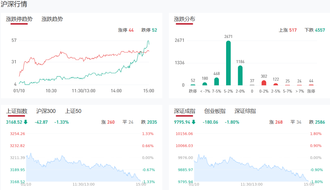 A股三大指数今日集体下跌,截至收盘,沪指跌1.33%,深成指跌1.80%,创业板指跌1.76%,北证50指数跌2.78%。全市场成交额11630亿元,较上日放量335亿元。全市场超4800只个股飘绿。
