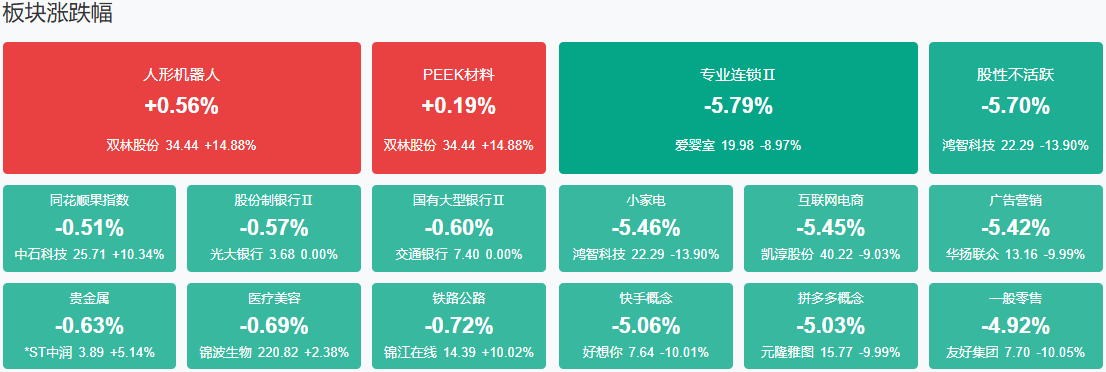 板块方面,机器人、半导体、PEEK材料板块涨幅居前;电商、零售、铜缆高速连接、AI眼镜等板块跌幅居前。