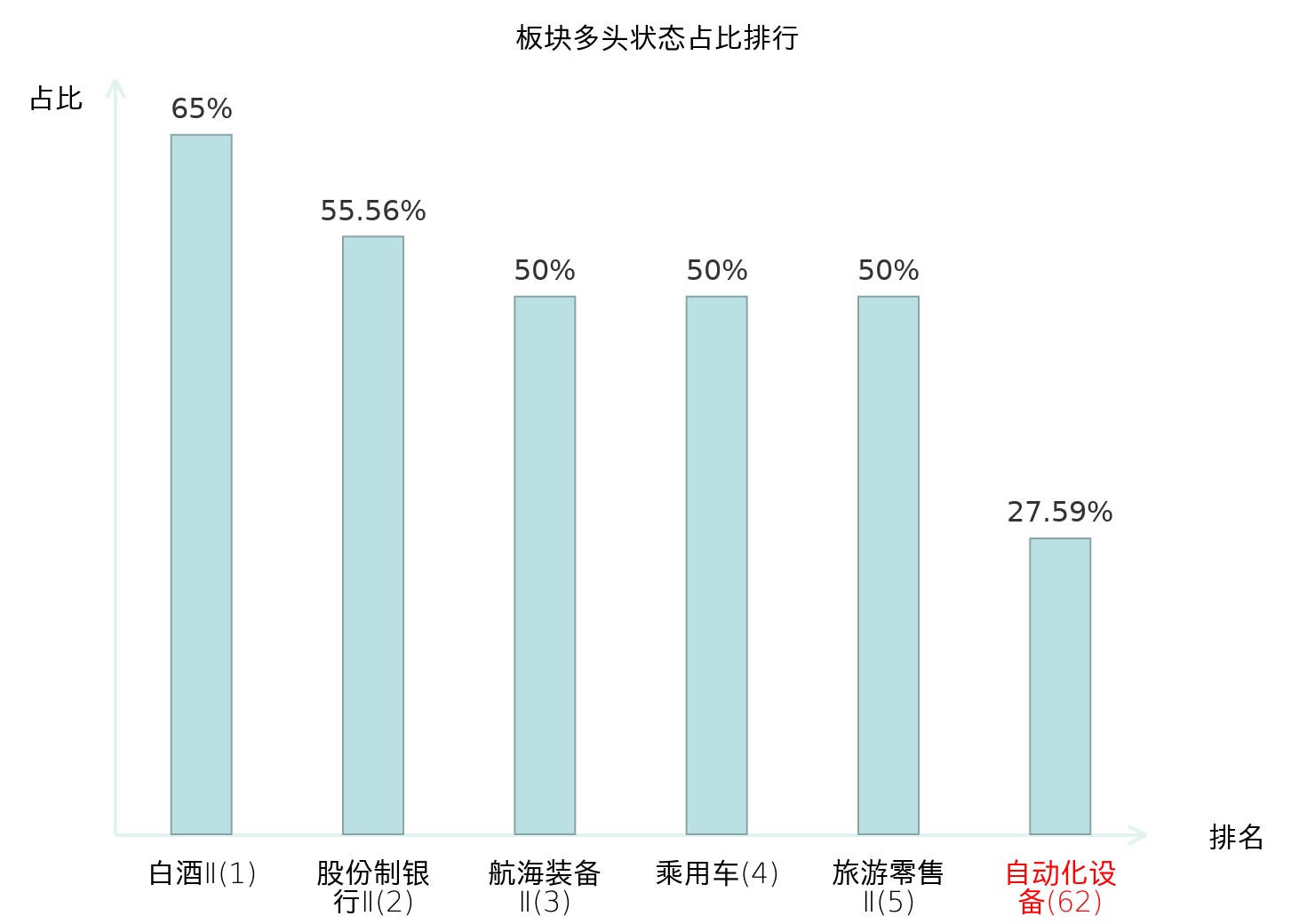 全市场所有行业板块中主力多头状态占比排名中,白酒Ⅱ板块位居第一。其他家电Ⅱ板块名次提升最快,较昨日上升93位。
