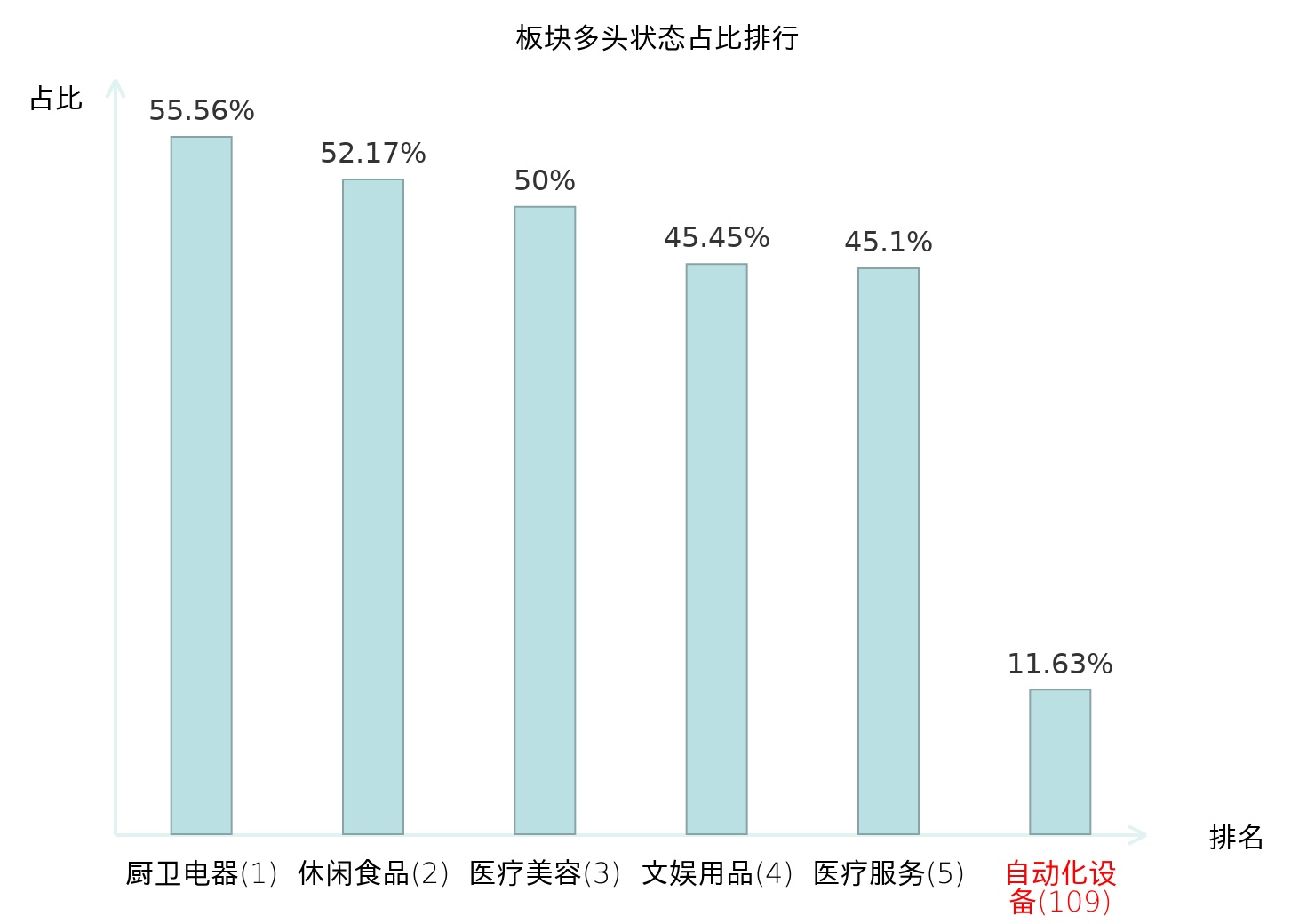 全市场所有行业板块中主力多头状态占比排名中,厨卫电器板块位居第一。林业Ⅱ板块名次提升最快,较昨日上升87位。