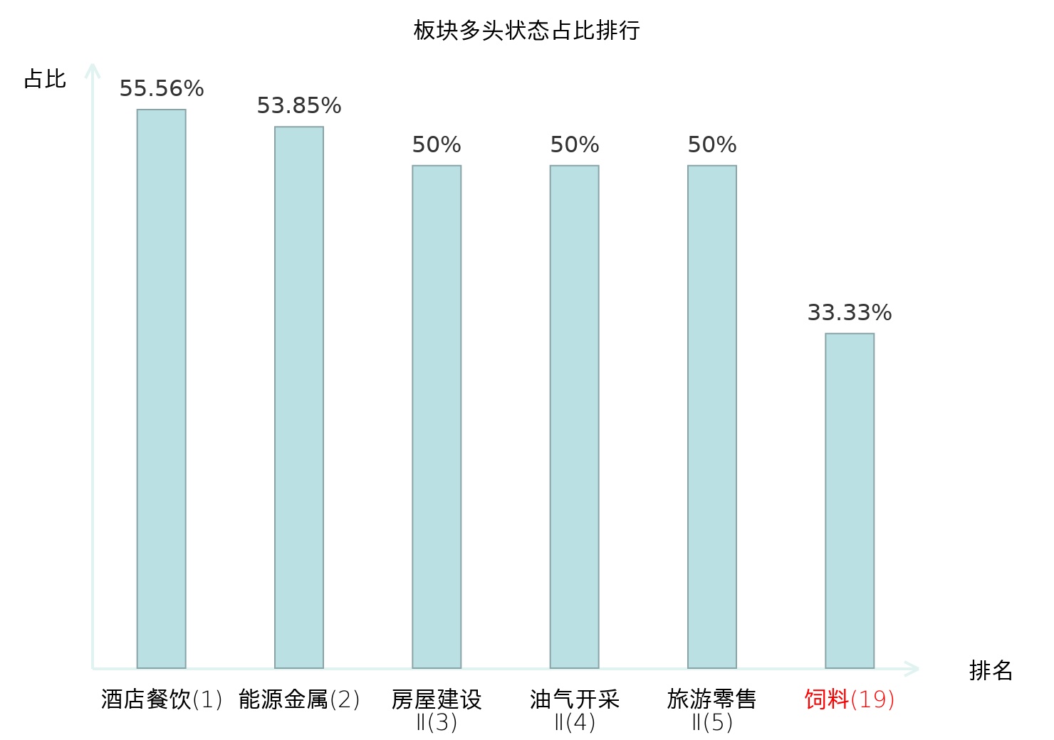全市场所有行业板块中主力多头状态占比排名中,酒店餐饮板块位居第一。饰品板块名次提升最快,较昨日上升84位。