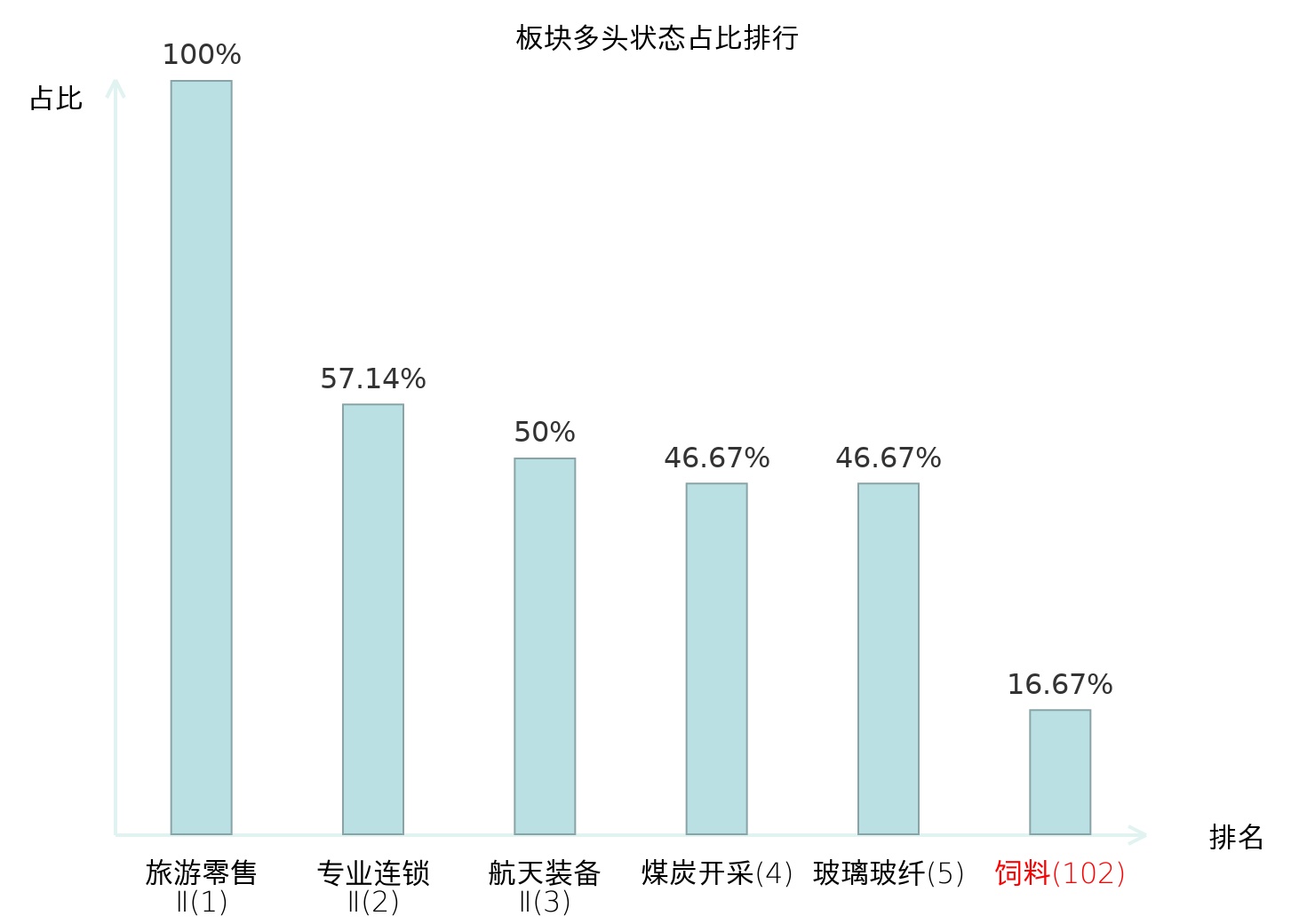全市场所有行业板块中主力多头状态占比排名中,旅游零售Ⅱ板块位居第一。普钢板块名次提升最快,较昨日上升64位。