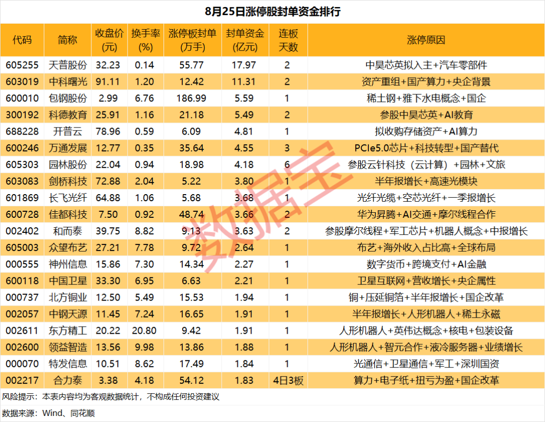 据证券时报·数据宝统计,今日(8月25日),从收盘涨停板封单量来看,包钢股份封单量高达186.99万手;天普股份和合力泰紧随其后,封单量分别为55.77万手、54.12万手;佳都科技、万通发展、*ST苏吴和科德教育封单量均在20万手以上。
