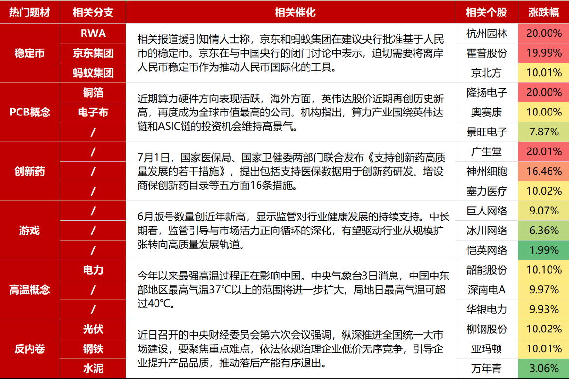 以上一些热点我们近期都讲过,稳定币属于是第一波发掘的,也在早间直播中跟大家讲过,跟低空经济的走势类似,反复出利好,反复活跃,等真落地后就会熄火,跟低空节奏相似。