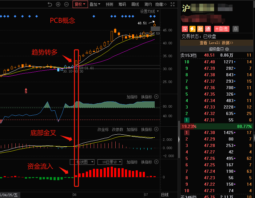 该标的为6月中旬分享过的业绩-PCB概念里的符合我们多维指标共振走势的标的,主力资金流入、趋势转升,底部金叉后截至本日发稿,涨幅显著,回撤较少。