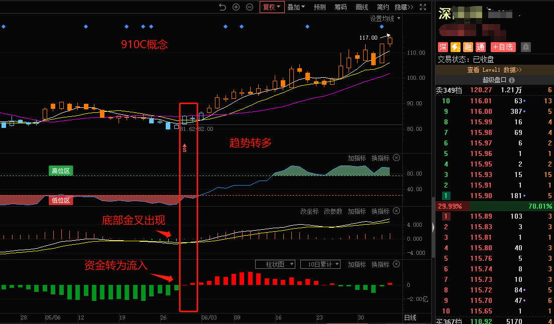 该标的为6月中旬分享过的华为910C概念里的符合我们多维指标共振走势的标的,主力资金流入、趋势转升,底部金叉后截至本日发稿,涨幅显著,回撤较少。