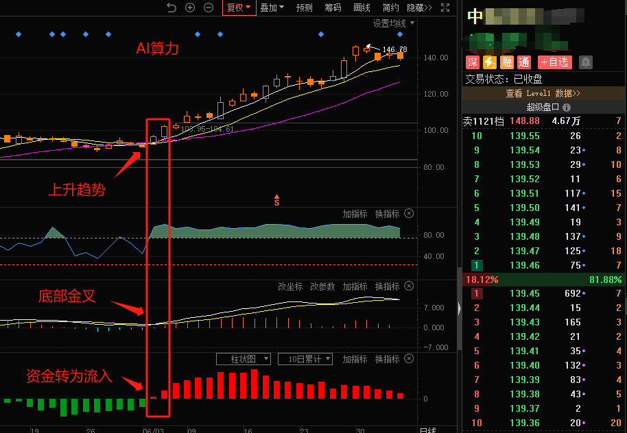 该标的为6月中旬分享过的AI算力概念里的符合我们多维指标共振走势的标的,主力资金流入、趋势转升,底部金叉后截至本日发稿,涨幅显著,回撤较少。