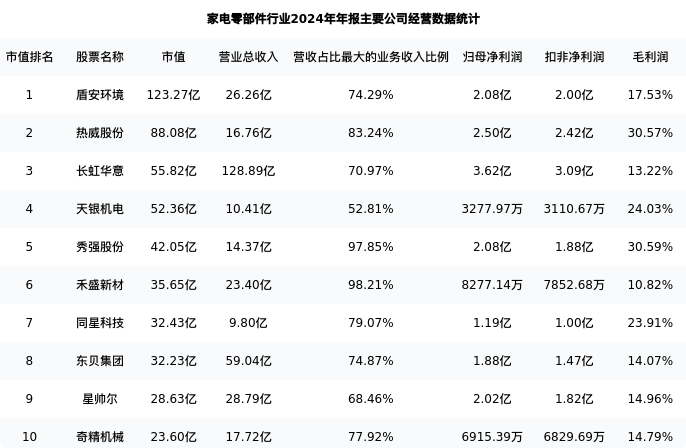 奇精机械最新报告期数据为年报,下表汇总了家电零部件行业内市值靠前的公司年报主要经营数据