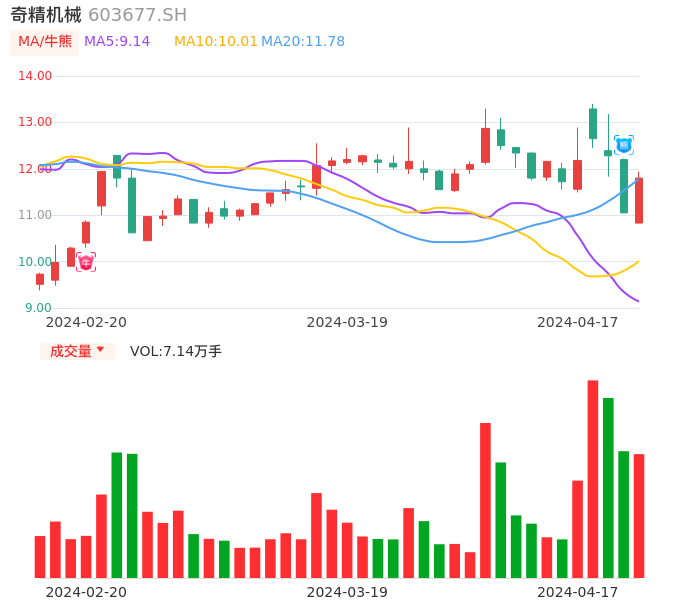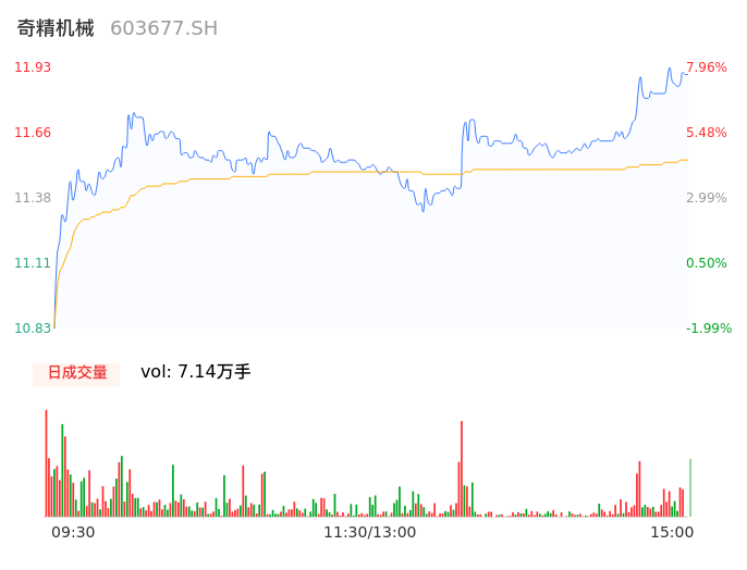 04月17日,奇精机械收报11.80,股价涨幅6.79%,成交金额8247.25万元,换手率3.72%。