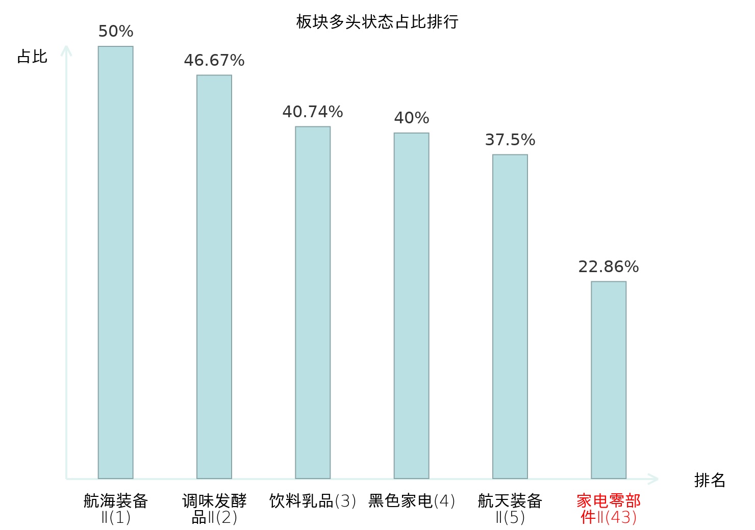 全市场所有行业板块中主力多头状态占比排名中,航海装备Ⅱ板块位居第一。航海装备Ⅱ板块名次提升最快,较昨日上升99位。
