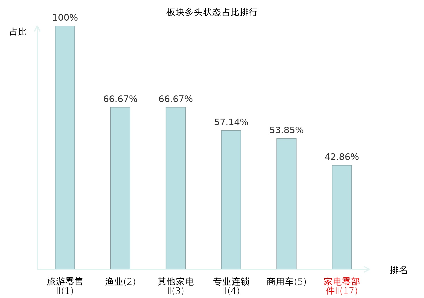全市场所有行业板块中主力多头状态占比排名中,旅游零售Ⅱ板块位居第一。农产品加工板块名次提升最快,较昨日上升46位。