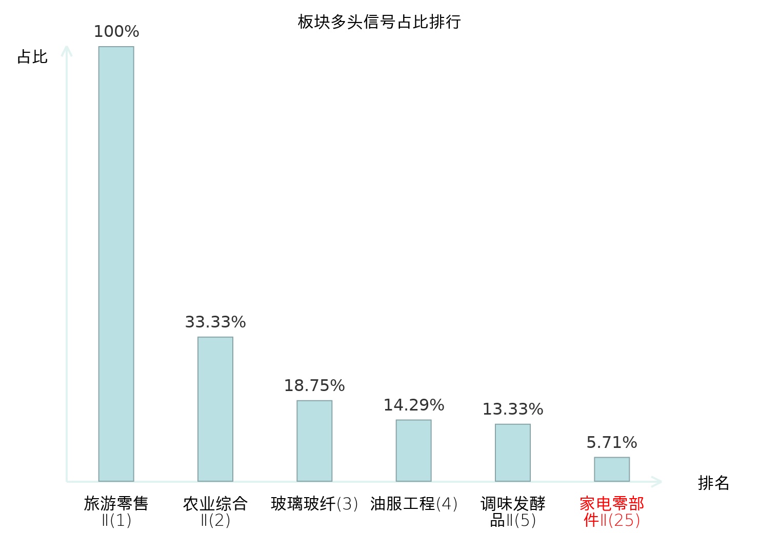全市场所有行业板块中主力多头信号占比排名中,旅游零售Ⅱ板块位居第一。旅游零售Ⅱ板块名次提升最快,较昨日上升130位。