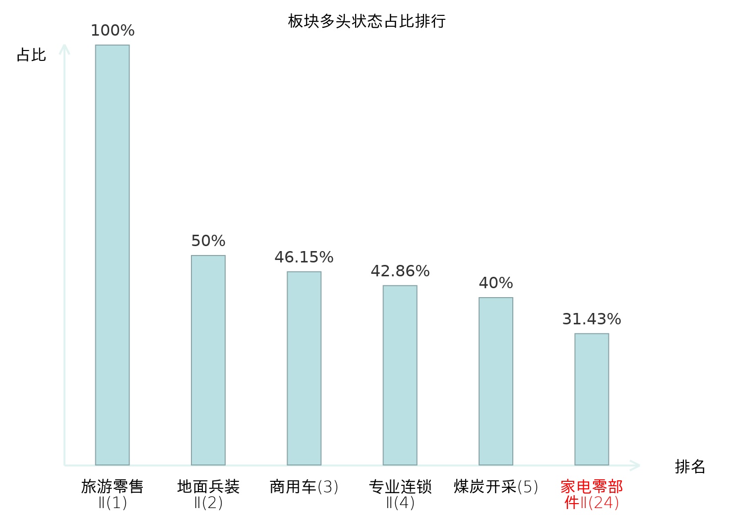 全市场所有行业板块中主力多头状态占比排名中,旅游零售Ⅱ板块位居第一。汽车服务板块名次提升最快,较昨日上升83位。