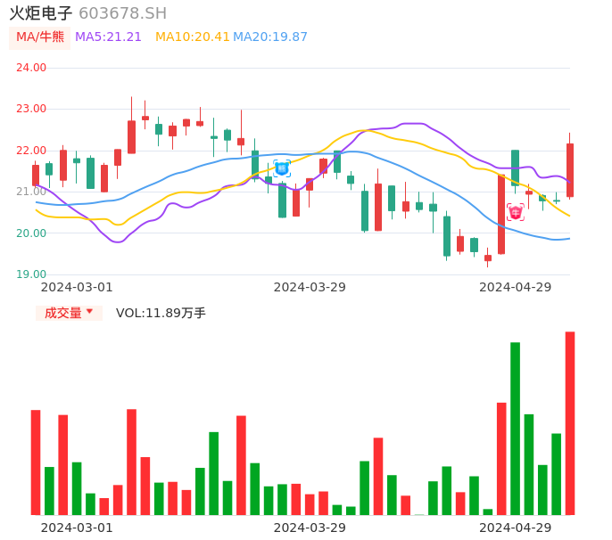 04月29日,火炬电子收报22.16,股价涨幅6.69%,成交金额2.60亿元,换手率2.59%。